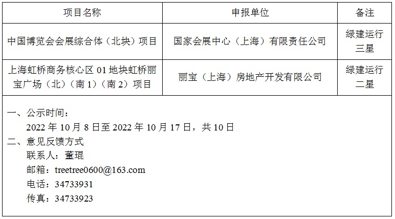 为进一步推动虹桥国际中央商务区建设国家绿色生态城区和本市低碳发展示范区,促进绿色、低碳、生态技术在虹桥商务区的区域化、规模化应用与发展,管委会按照《上海市虹桥商务区专项发展资金管理办法》(沪财预[2019]15号)、《上海市虹桥商务区专项发展资金使用管理实施细则》(沪虹商管[2019]95号),《上海虹桥商务区管委会关于推进低碳实践区建设的政策意见》(沪虹商管[2019]101号)、以及《2022年度虹桥国际中央商务区支持低碳实践区建设政策申报指南》的文件要求相关规定,经过初审、专家评审、相关职能部门联合评审,虹桥国际中央商务区管委会党组会审议通过,对以下2022年度推进低碳实践区建设专项发展资金拟补贴项目进行公示如下: