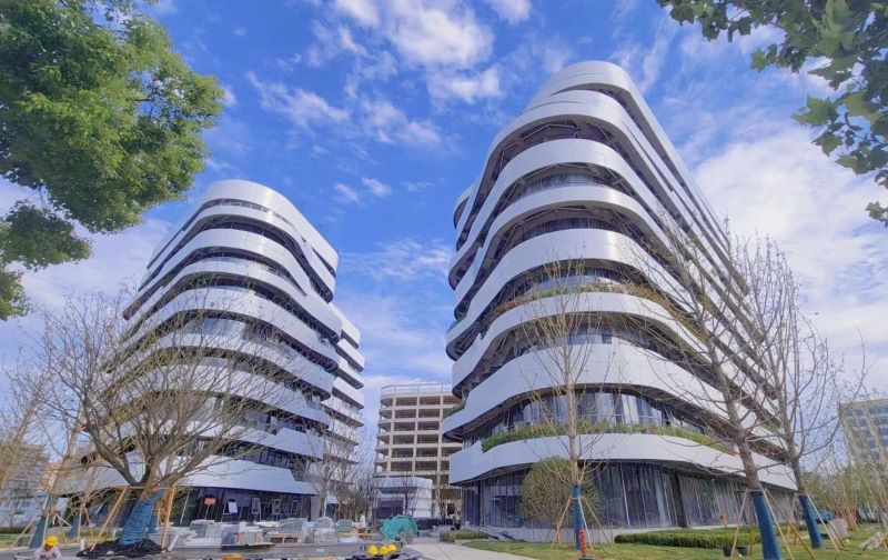 在位于鹤旋东路的MAX科技园(上海·虹桥)项目现场,两栋研发办公总部大楼的弧形外立面已完整呈现,工人在进行内部装修和绿化工作。