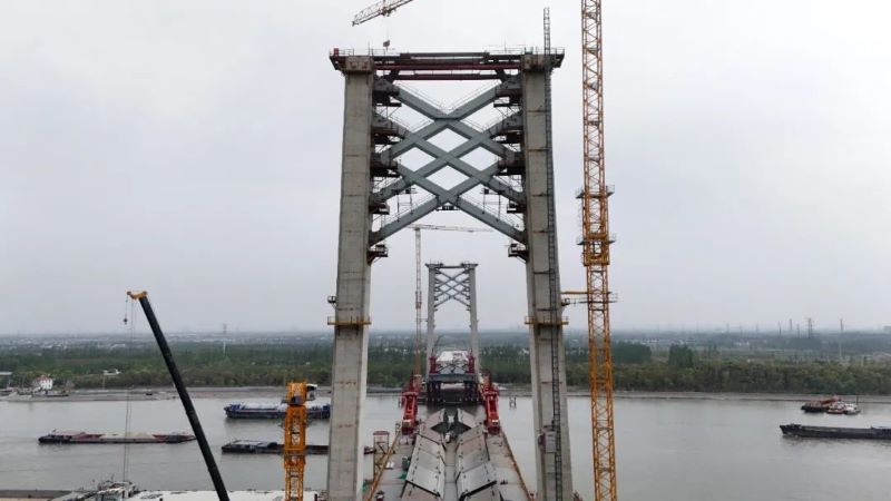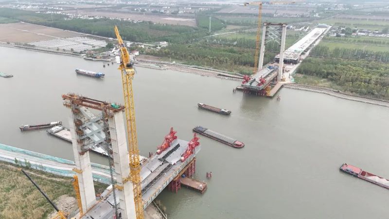 工程位于松江区,北起金平路,南至松金公路,全长约1.825公里。主要建设内容为新建1座车道规模双向6条机动车道、2条非机动车道的跨江大桥,以及1座主线跨河中小桥和3座辅道桥及相关护岸工程。截至目前,主桥已完成全部桩基、承台、主塔施工,主梁安装完成近50%,引桥及道路工程已完成全部桩基、承台、墩柱、盖梁的施工,上部小箱梁安装完成超80%,桥面铺装及防撞墙完成约55%,计划于今年9月完成主桥合龙,2026年底建成通车。