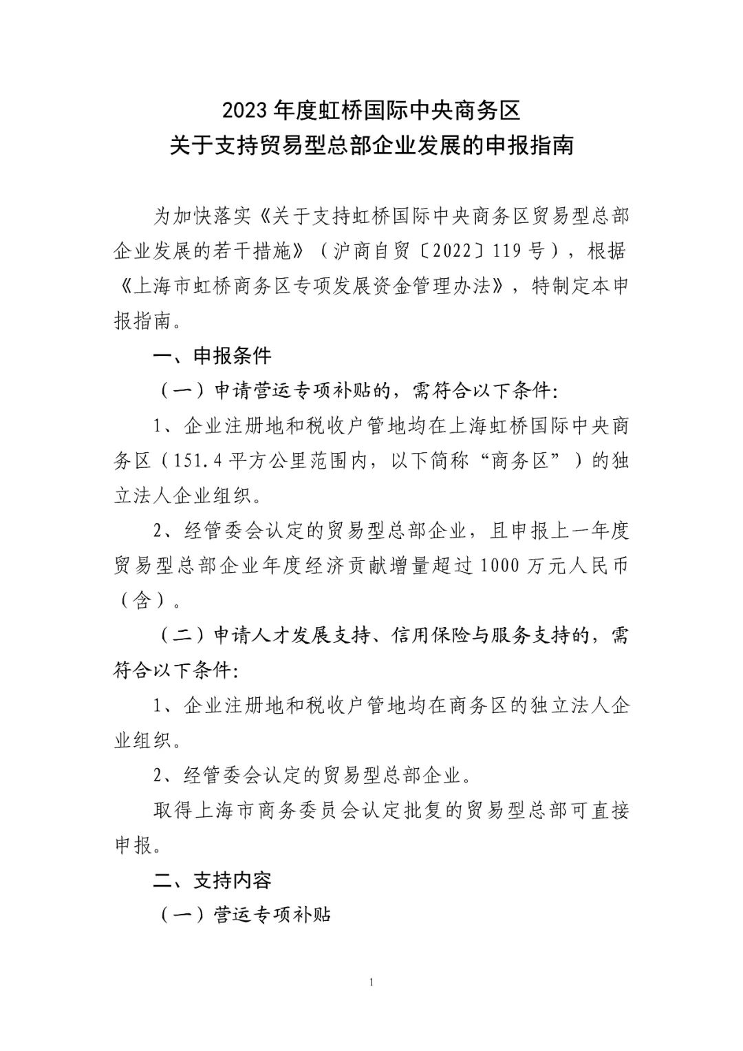 2023年度虹桥国际中央商务区关于支持贸易型总部企业发展的申报指南