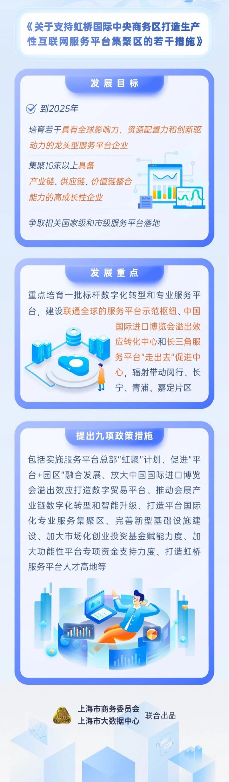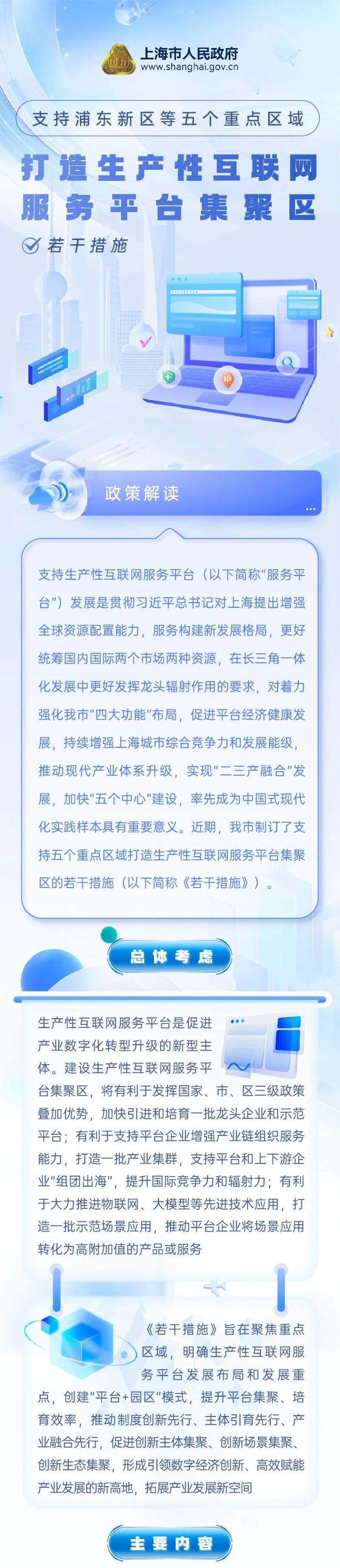 市商务委、市大数据中心介绍,近日,市政府办公厅印发《关于支持浦东新区打造社会主义现代化建设引领区生产性互联网服务平台集聚区的若干措施》《关于支持宝山区打造吴淞创新城等生产性互联网服务平台集聚区的若干措施》《关于支持普陀区打造半马苏河有色金属生产性互联网服务平台集聚区的若干措施》《关于支持临港新片区打造临港科技城生产性互联网服务平台集聚区的若干措施》《关于支持虹桥国际中央商务区打造生产性互联网服务平台集聚区的若干措施》。五个重点区域的《若干措施》自2024年1月15日起施行,有效期3年。点击文末“阅读原文”可查看政策原文。详见↓