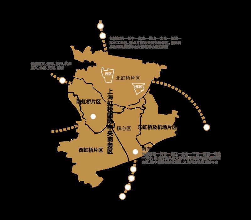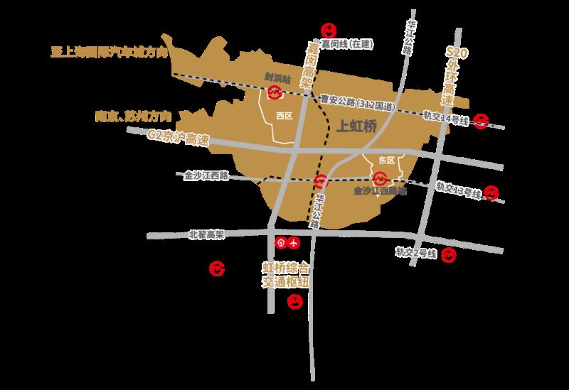 “上虹桥·城市更新区”位于上海虹桥国际开放枢纽核心区,总面积约167公顷,地处嘉定、普陀、闵行、长宁四区交汇处,交通便利,陆轨空三位一体,嘉闵高架、京沪高速、外环高速等穿越而过,是直接承接上海与长三角城市群“同城效应”的区域之一;轨交13号线、14号线、嘉闵线环绕,直达南京西路、张江国家自主创新区等上海核心商务区与产业板块。