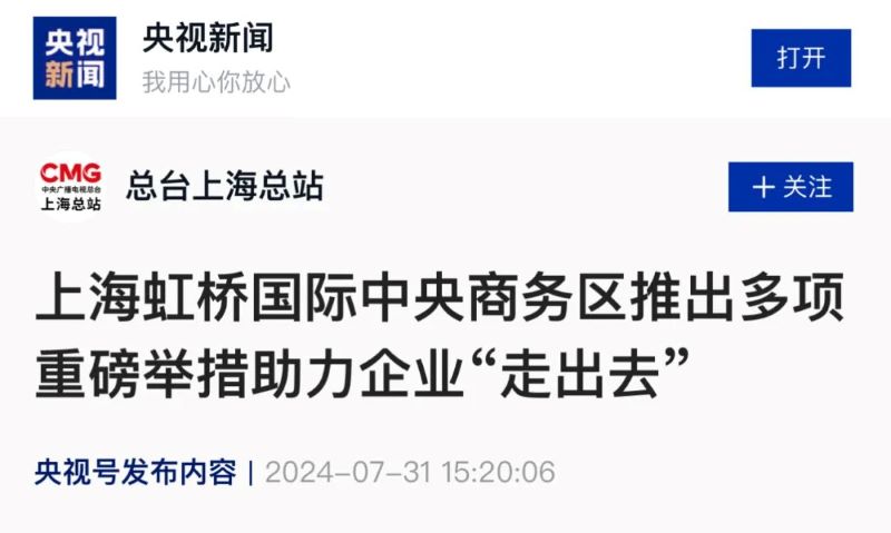 7月30日,2024“潮涌浦江·投资虹桥”活动暨“2024虹桥国际中央商务区投资促进大会”在国家会展中心(上海)举行。在重点项目签约仪式上,商务区管委会与9家金融、投资机构举行了签约仪式,聚焦企业出海、丝路电商、重点产业三个领域,提供超过4000亿元的专项信贷额度,从而为商务区各类企业“走出去”提供精准专业的金融服务。